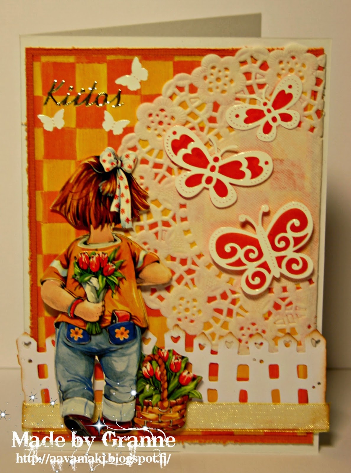 Tyttönen on 3D kasaus, aita Magnolian ja perhoset sekä teksti ääriviivatarroja ... joten aika simppelillä linjalla tämä, mutta pirtsakkahan se on, :D
