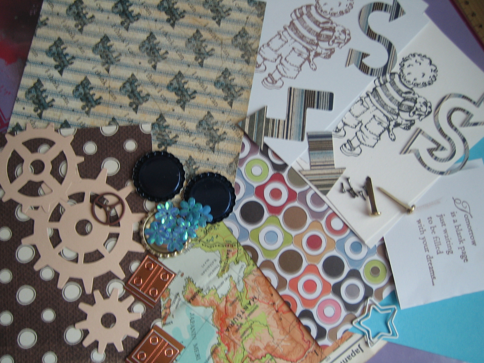 Stanssailin rattaita, pullonkorkkeja ja nuolia, Tim Holtzin pikkuruisia haaraniittejä ja yksi ratas eksyi myös pusseihin, tarrasaranat ja sen semmosta. Magnolian runoleimasin ei minulle nyt taipunut ollenkaan. Yritin leimata sen 10 kertaa, enkä yhtään siistiä aikaansaanosta saanut aikaan, mrrrr - pahoittelen kanssarinkiläiset. Yllättäen tämä itse kasaamani sekametelisoppa oli sitten itselleni ihan liikaa, enkä meinannut millään saada korttia aikaiseksi, :0. Sitten otin vaan "pääaiheeksi" tuon veturipaperin, josta kaikista eniten tässä paketissa tykkään ja siitä rupesin väkräämään: